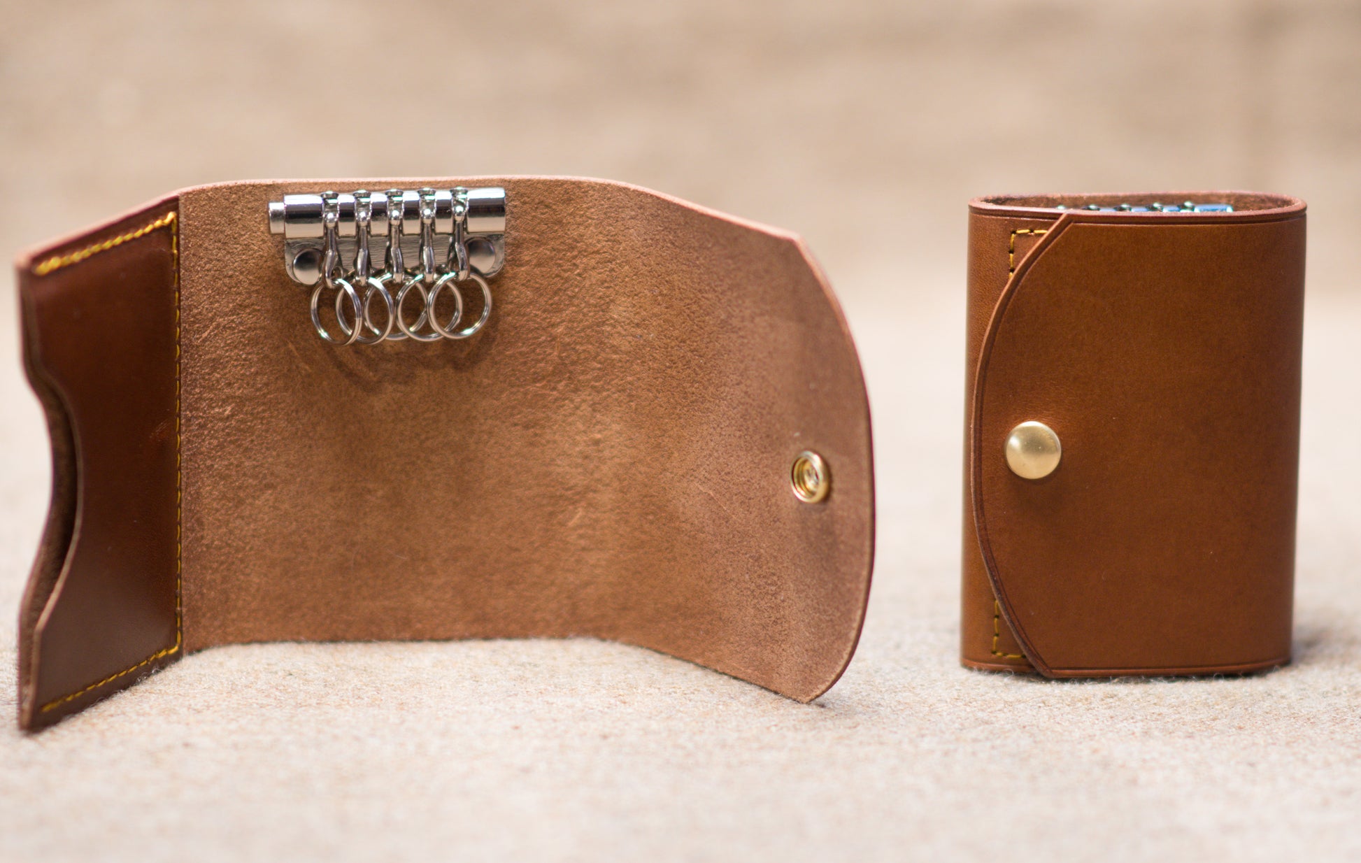 5 detachable key rings, with card pocket to hold 4-6 cards. Made for a friend to hand out as a classic gift. 7oz "whiskey" color Buttero from Conceria Walpier (Italy) with burnished flesh side.